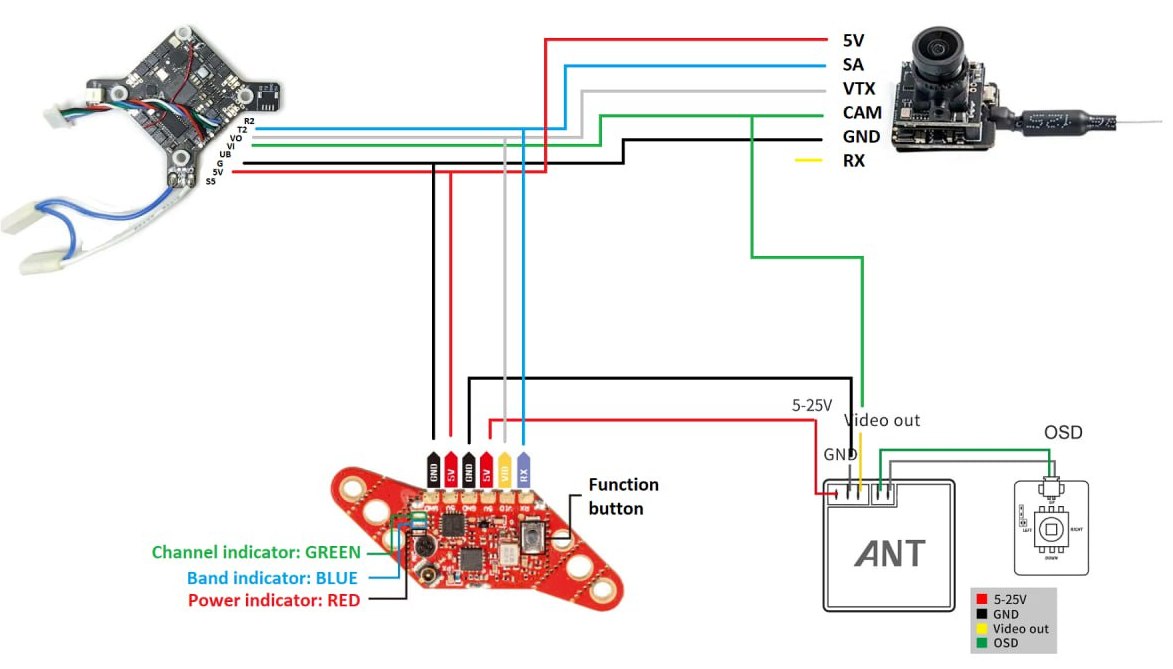 2. Видео с камеры идёт в VTX, оттуда сквозняком в полетник, там накладывается ОСД, и обратно в VTX на передачу.