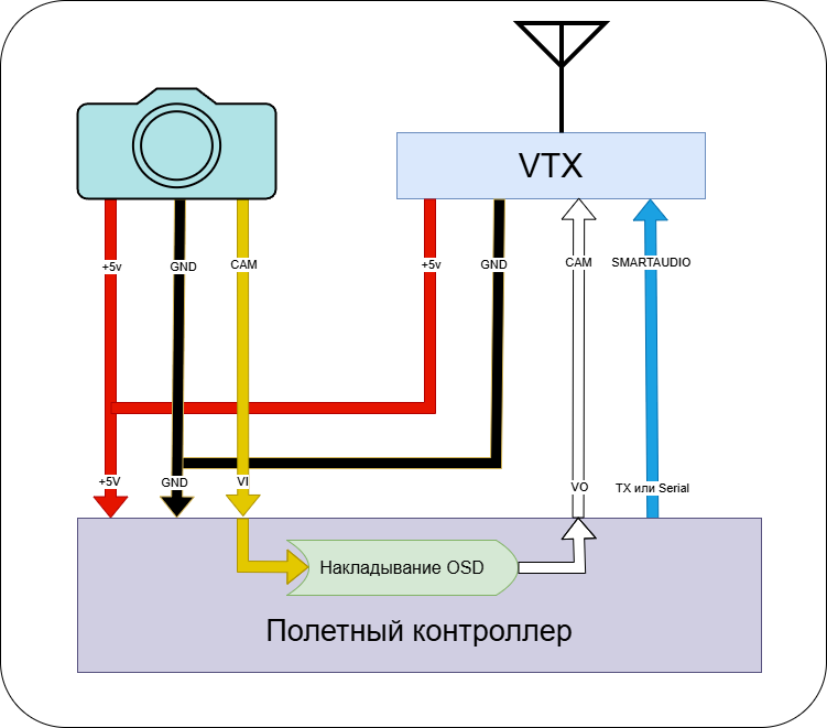 - Видеосигнал камеры заходит в полетник. Там накладывается OSD и итоговое изображение отдается в VTX на передачу в эфир.