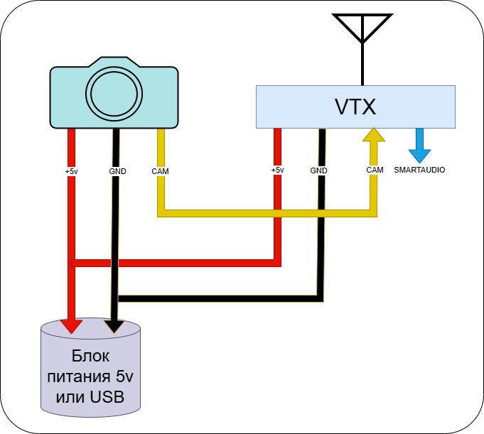 Дисклеймер: В статье ниже указывается напряжение 5в, которое подается и на камеру и на VTX. Такое чаще всего бывает на компонентах для вупов и небольших дронов.