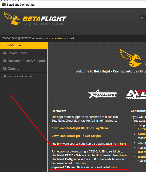 К конфигуратору можно подключать только дроны на прошивке Betaflight.