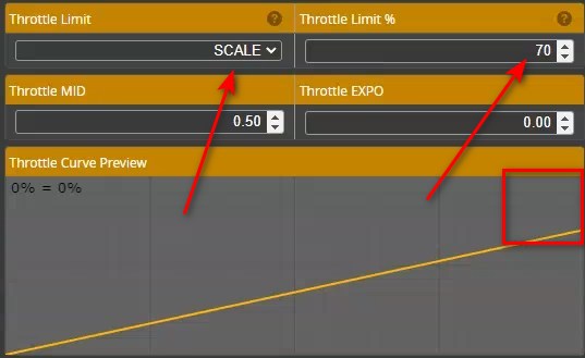 Теперь даже если поднять стик газа максимально вверх, моторы будут работать на 70% мощности. При этом весь ход стика газа равномерно распределится на эти 70%. Таким образом будет легче контролировать газ, чтобы дрон не "прыгал"