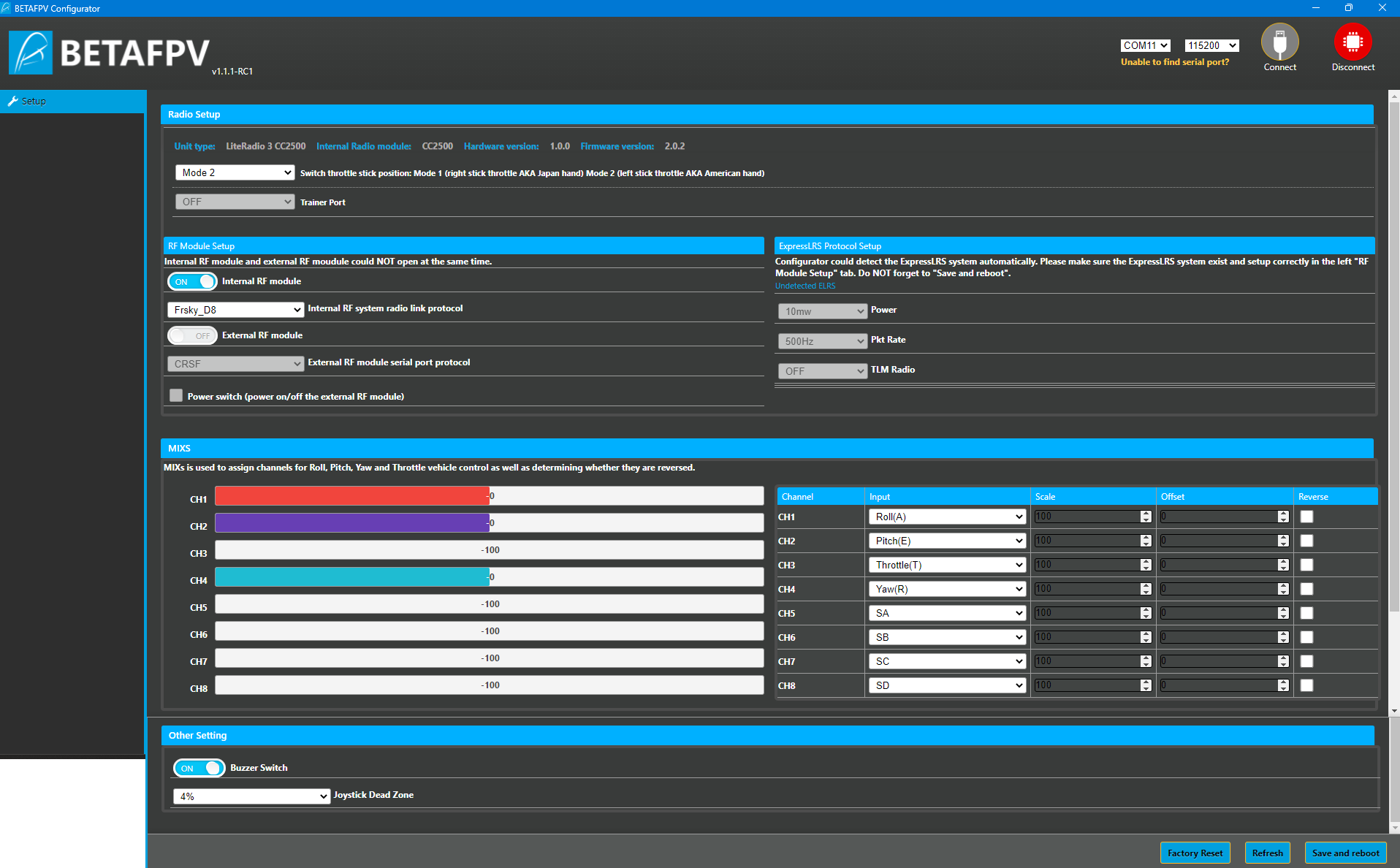 Аппы от BETAFPV можно подключить только к программе BETAFPV Configurator. Возможностей по настройке там крайне мало, но иногда это бывает нужно. Вот скриншот экрана с настройками.