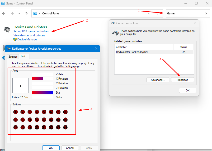 и увидеть в окне все кнопки, переключатели и стики пульта. Можно подвигать на пульте стики, понажимать кнопки и убедиться, что все каналы работают.