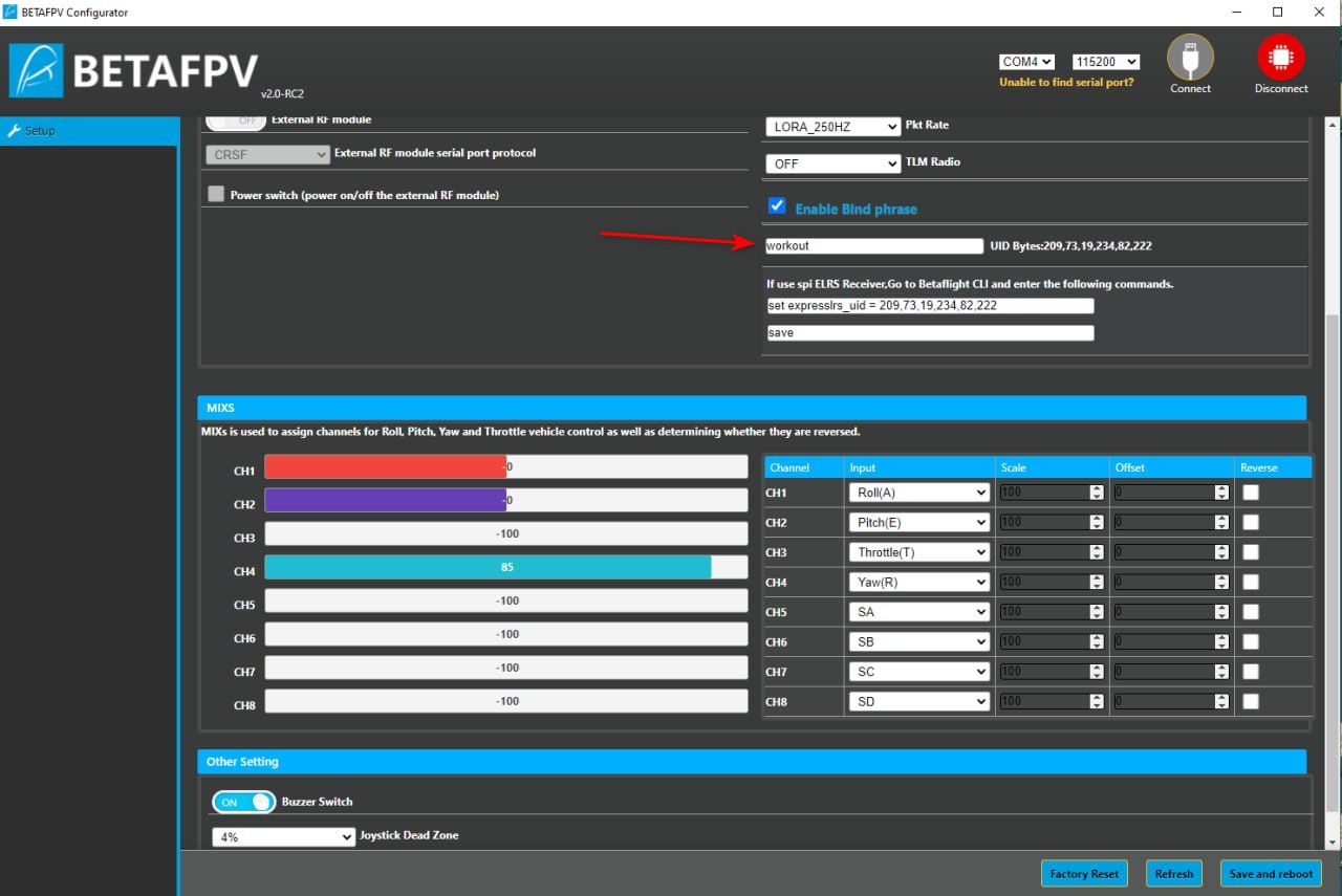 Бинд фраза вводится в BETAFPV Configurator.